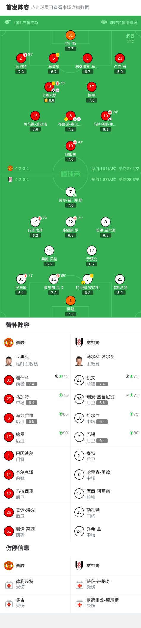 北京时间2月1日英超联赛第24轮,曼联主场对阵富勒姆。上半场,卡塞米罗头球得分。下半场库尼亚小角度破门,之后富勒姆凭借劳尔-希门尼斯与凯文的进球扳平比分,补时阶段,谢什科扫射破门。最终比分曼联3-2富勒姆。